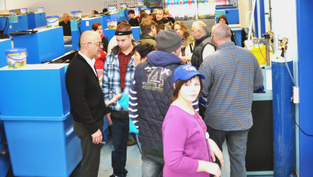 Der Großhändler EFS hat bei seiner Kaltwasser-Messe Besuchern die neue Kaltwasserhalle präsentiert, in der Becken mit einem Fassungsvolumen von insgesamt 125.000 l stehen. Neben einem vergrößerten Produkt-Sortiment präsentierte das Unternehmen außerdem seine zahlreichen Koi, die alle aus Biosecure-Anlagen importiert werden.