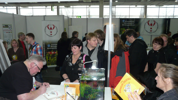 Letzteres wurde vom Dähne Verlag zusammen mit dem Arbeitskreis Wirbellose in Binnengewässern (AKWB) ausgerichtet. Über 160 Tiersätze nahmen am Garnelenchampionat teil, mehr als doppelt so viel wie noch im Vorjahr. Präsentiert wurden sie in Aquarien von Eheim, Hagen (Fluval) und Tetra. Stargast des Aquascaping-Wettbewerbs war der bekannte Aquascaper und Naturfotograf Takashi Amano aus Japan, der zudem eine Signierstunde für das im Dähne Verlag erschienene Buch „Naturaquarien“ gab.