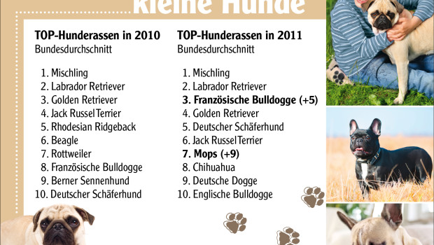 Im Vergleich zu 2010 verbuchte der Hund mit den Fledermausohren mit Abstand den größten Beliebtheitszuwachs. Während der Mischling und der Labrador Retriever ihre Plätze verteidigten, machte die Bulldogge im Ranking einen großen Satz von Platz acht auf drei. Als neuer Sympathieträger präsentierte sich außerdem der Mops. Tauchte er 2010 gar nicht unter den zehn beliebtesten Hunderassen auf, belegt der Vierbeiner englischen Ursprungs 2011 den siebten Platz.