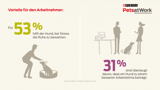 Knapp die Hälfte (47 Prozent) aller Hundebesitzer, die ihren Hund mit zur Arbeit nehmen dürfen, können den Arbeitsalltag aufgrund des Hundes mehr als Teil ihres Lebens genießen. 43 Prozent der Befragten hilft der Hund beim Einhalten von regelmäßigen Pausen und mehr als der Hälfte, in stressigen Situationen Ruhe zu bewahren.