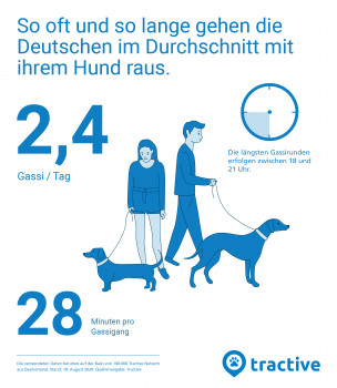 Am Wochenende fallen die Spaziergänge durchschnittlich 16 Prozent länger aus als unter der Woche. Die Auswertungen stellen ebenfalls dar, dass Länge und Häufigkeit der Spaziergänge von Rasse zu Rasse variieren. Der Bewegungsdrang ist aber nicht nur von der Rasse, sondern auch vom Alter der Hunde abhängig. So haben Welpen (<15 Monate) einen deutlich höheren Aktivitätsdrang als ausgewachsene Hunde.