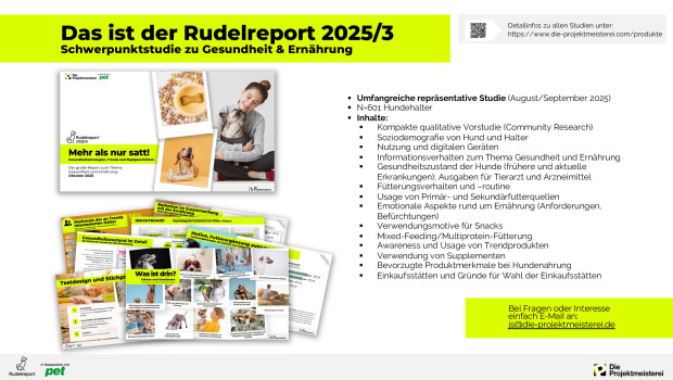 Es ist so weit: Der dritte Rudelreport zu den spannenden Themen „Hundegesundheit und -ernährung“ steht ab sofort zur Verfügung. Die Projektmeisterei liefert wieder in Kooperation mit pet umfangreiche Marktforschungsergebnisse zum Gesundheitszustand der Hunde sowie in aller Breite zum Thema Fütterung und Trends.
