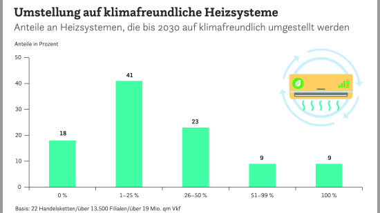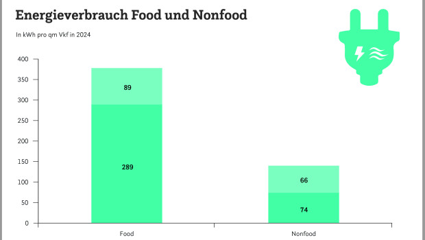 Insbesondere die zunehmende Nutzung von Wärmepumpen führt zu einer Verschiebung von Wärmeenergie auf elektrische Energie. Der Wärmeenergieverbrauch liegt im Food-Handel bei durchschnittlich 89 kWh/m2 Verkaufsfläche und im Nonfood-Handel bei 66 kWh/m2. Im Lebensmitteleinzelhandel (LEH) ist die Kältetechnik der größte Stromfresser (52 Prozent), gefolgt von Beleuchtung (20 Prozent) und Klimatisierung/Lüftung (9 Prozent). Im Nonfood-Handel sind Beleuchtung mit 56 Prozent und Klimatisierung/Lüftung mit 29 Prozent die größten Stromverbraucher.