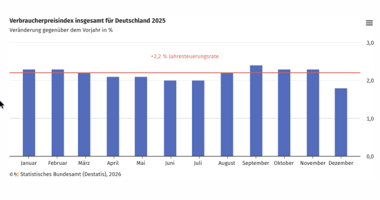Die Inflationsrate in Deutschland lag im Dezember 2025 gegenüber Dezember 2024 bei +1,8 %, nach jeweils +2,3 % im November und Oktober 2025. Damit hat sich der Preisauftrieb zum Jahresende abgeschwächt. Im Dezember 2025 verstärkten sich insbesondere die Preisrückgänge bei Energie und dämpften somit die Inflationsrate in stärkerem Umfang: Die Preisveränderungsrate für Energie lag im Dezember 2025 gegenüber Dezember 2024 bei -1,3 %, nach -0,1 % im November 2025 gegenüber November 2024.