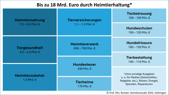 2024 war die Heimtierhaltung in Deutschland mit Umsätzen in Höhe von insgesamt gut 18 Milliarden Euro verbunden. Das ist das Fazit der neuen „Heimtierstudie 2025: Update und Trends zur wirtschaftlichen Bedeutung der Heimtierhaltung in Deutschland“ von der Ökonomin Prof. Renate Ohr von der Georg-August-Universität Göttingen, die ehemals die Professur für Volkswirtschatfslehre, inbesondere Wirtschaftspolitik, innehatte. Sie wurde am 21. Januar der Öffentlichkeit vom Industrieverband Heimtierbedarf (IVH vorgestellt. Abzüglich der darin enthaltenen Importe ergebe das einen Beitrag der Heimtierhaltung zur deutschen Wertschöpfung von etwa 15,2 Mrd. €, was einem Anteil von ca. 0,35 Prozent am deutschen Bruttoinlandsprodukt entspreche. Der Beitrag zur Wertschöpfung lag damit bei mehr als einem Drittel des Beitrags von Land- und Forstwirtschaft inklusive Fischerei (39,6 Mrd. €/0,9 % BIP). „Damit sind geschätzt bis zu 165.000 Arbeitsplätze verbunden“, so Ohr in ihrer Studie.