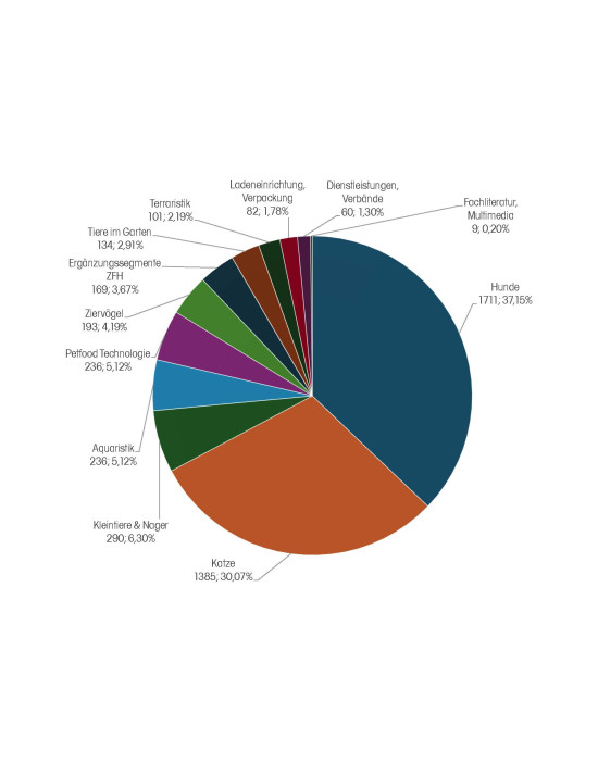Auffällig: Das Segment Katze holt auf Hund auf: 37,15 Prozent der Aussteller bieten Futter und/oder Zubehör für Hunde an, 30,07 Prozent für Katzen. Erst weit dahinter folgen Kleintiere und Nager mit 6,3 Prozent und Aquaristik mit 5,12 Prozent.